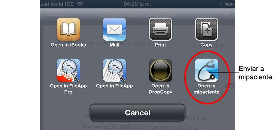 PDF la aplicación de su dispositivo y tocar el botón de enviar, que le desplegará esta pantalla, en donde toca