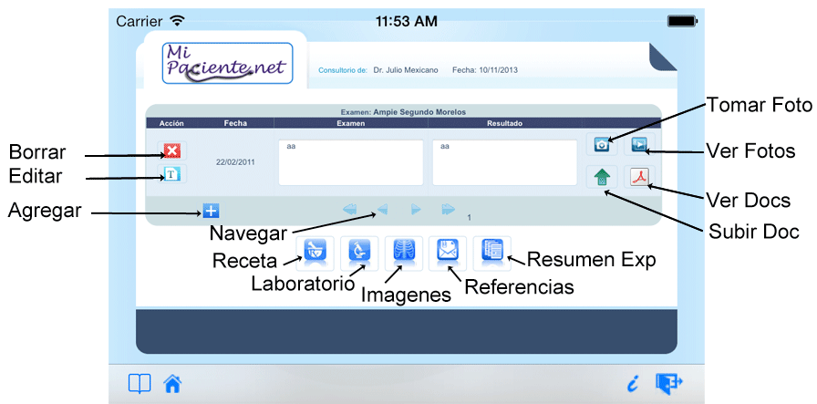 La barra inferior se verá en todas las fichas de un paciente existente, para