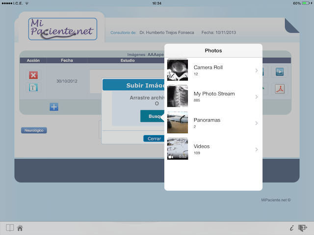 Al dar click en el boton "Busque" le aparecerá el selector de imágenes de su dispositivo, en donde debe escoger el grupo de imágenes en que se encuentran las que quiere archivar en el expediente médico del paciente. En iPad luce así: