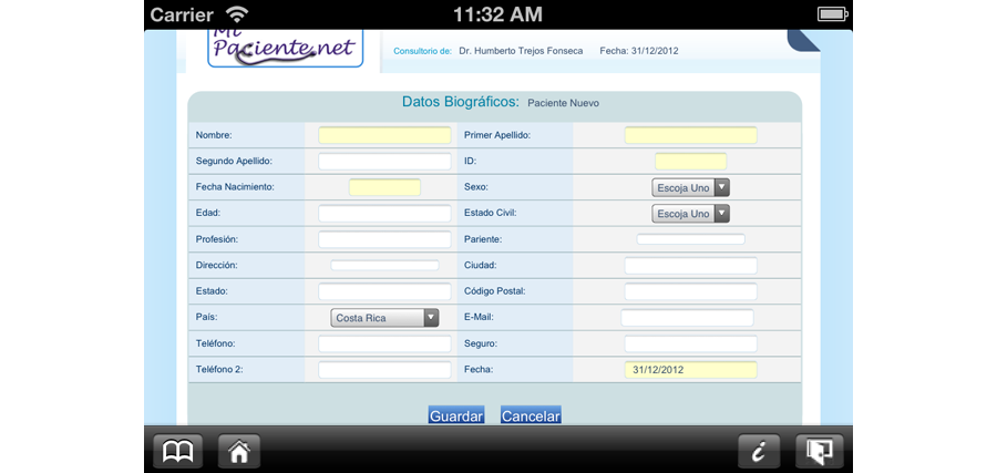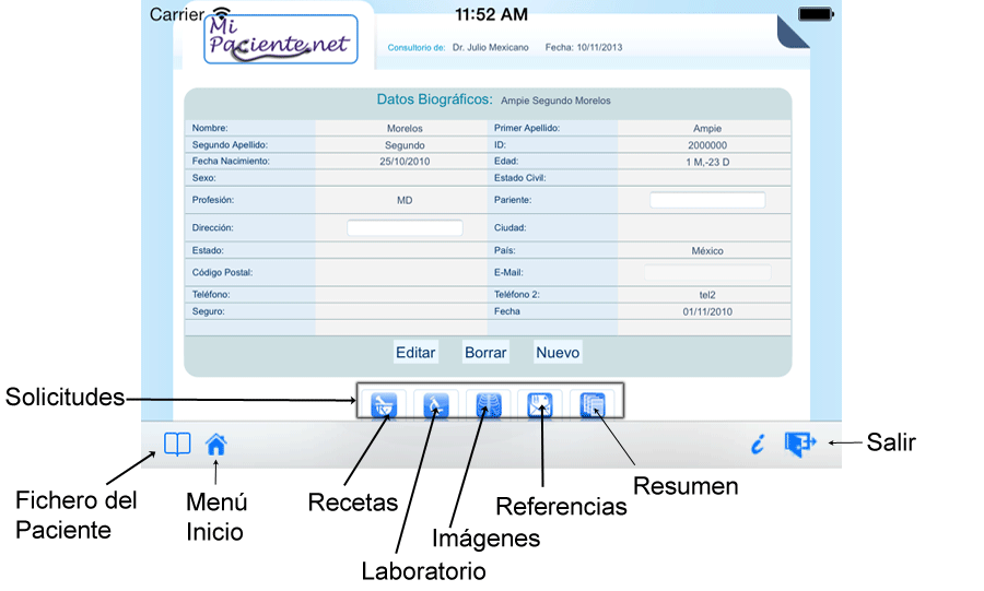 Si usted escogió un paciente existente, esta será la ficha que verá. En la barra